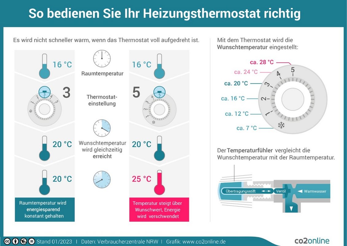 Lüften Sie Ihre Räume mit weit geöffneten Fenstern (Stoß- oder Querlüften). Die warme und feuchte Raumluft wird rasch gegen kühlere und trockenere Außenluft ausgetauscht. Die in Wänden und Decke gespeicherte Wärme bleibt jedoch im Raum. Die Thermostatventile sollten Sie kurz vor dem Lüften auf Null stellen, so dass die Restwärme der Heizkörper noch genutzt wird.